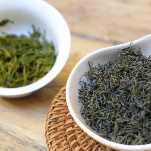 Een leuke vorm voor een groene thee, het blad is gerold tot korrels. De thee is gemaakt van nieuwe uitlopers bestaande uit het topje en 2 blaadjes, net na het Qingming festival. Na het plukken wordt de thee verhit in de wok en daarna gerold tot korrel. Als laatste wordt het blad nog gedroogd. De smaak is grassig, fris en mild.